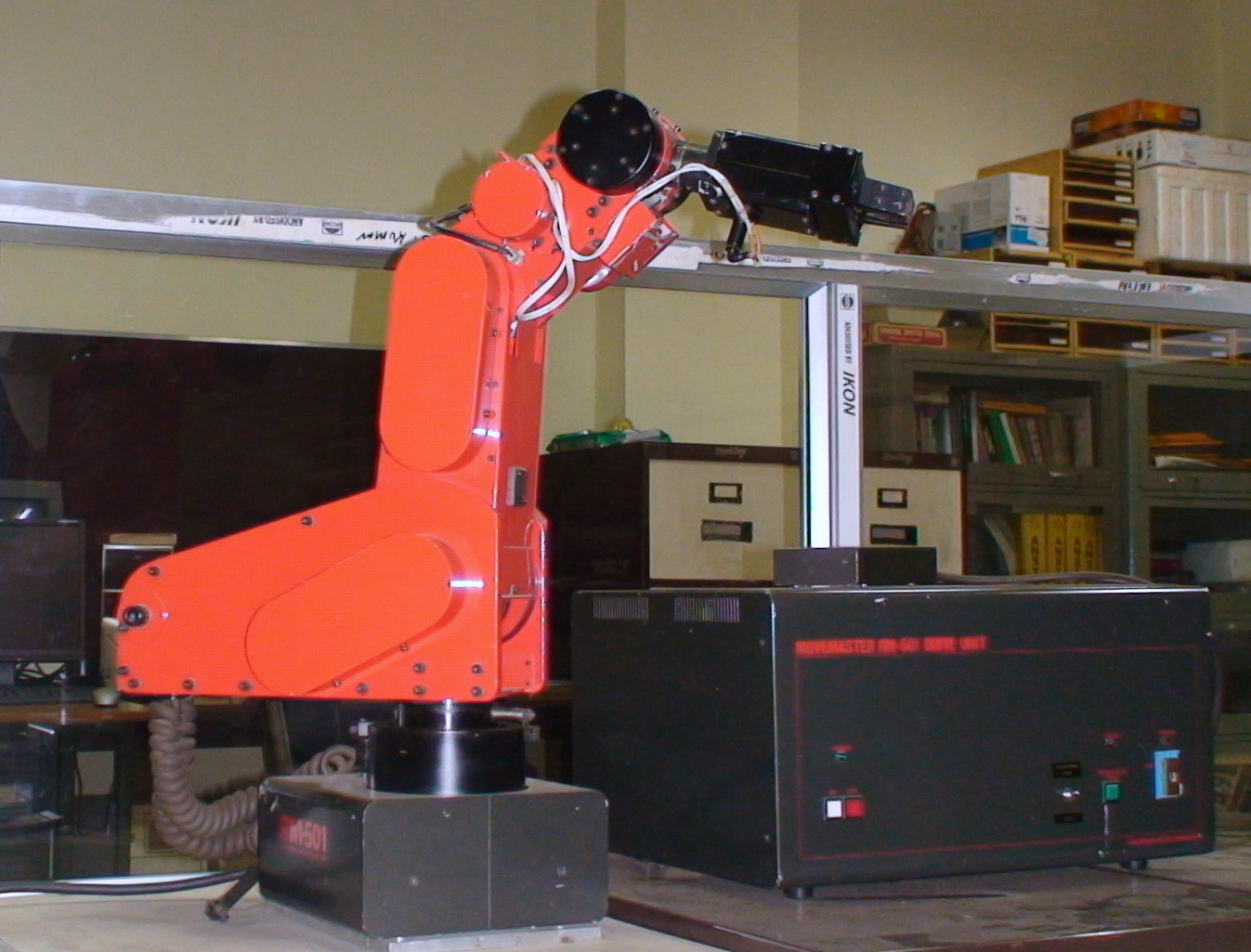 The Mitsubishi Movemaster RM-5012 robot is a robotic arm with five rotational joints. These are actuated with DC motors to each of which two encoders are associated which allow differential directional information to be read for each joint. The overall size of the robot is comparably small with a circular work envelope of 445mm maximum horizontal reach and a maximum payload of 1.2kg.