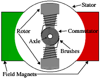 Every DC motor has six basic parts -- axle, rotor (i.e. armature), stator, commutator, field magnet(s), and brushes. The stator is the stationary part of the motor -- this includes the motor casing, as well as two or more permanent magnet pole pieces. The rotor (together with the axle and attached commutator) rotate with respect to the stator. The rotor consists of windings (generally on a core), the windings being electrically connected to the commutator. The above diagram shows a common motor layout -- with the rotor inside the stator (field) magnets. The geometry of the brushes, commutator contacts, and rotor windings are such that when power is applied, the polarities of the energized winding and the stator magnet(s) are misaligned, and the rotor will rotate until it is almost aligned with the stator's field magnets. As the rotor reaches alignment, the brushes move to the next commutator contacts, and energize the next winding.