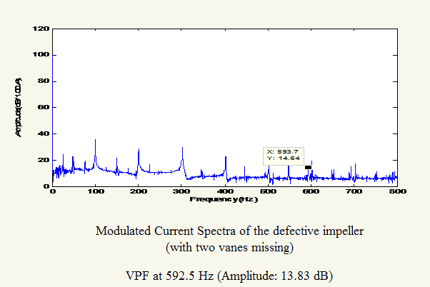 Test 3 The third test was performed with a defective impeller (with two vanes missing). < Fig. 1: The figure of a defective impeller (with two vanes missing) (Fig 2) (Fig 3) Attachment: Current Time Domain Attachment: Vibration Time Domain