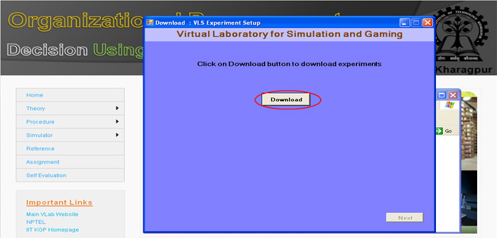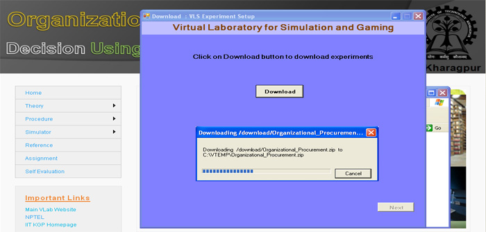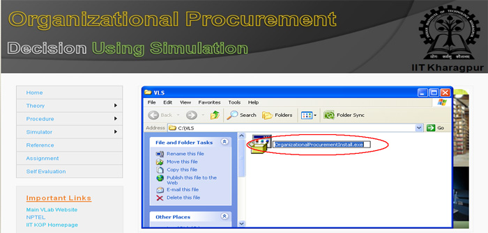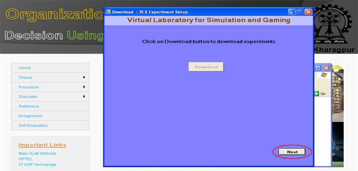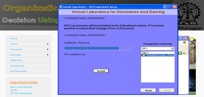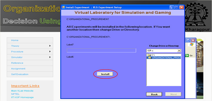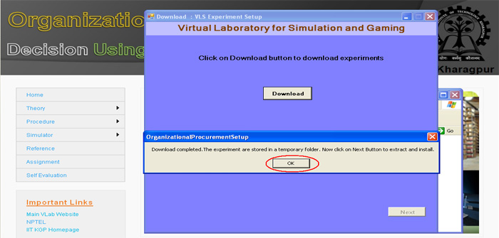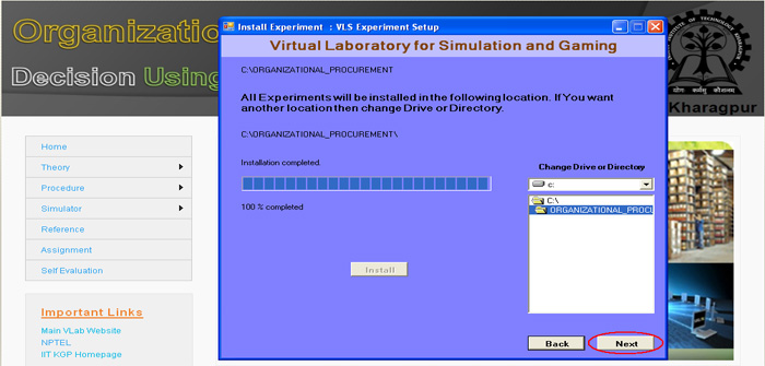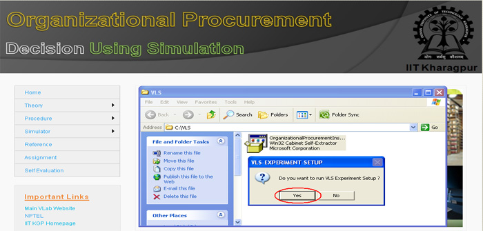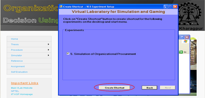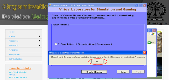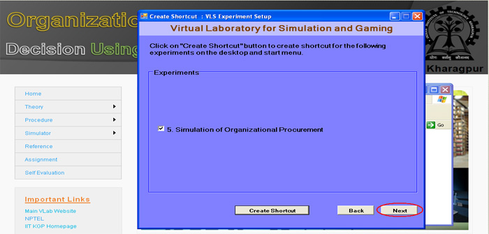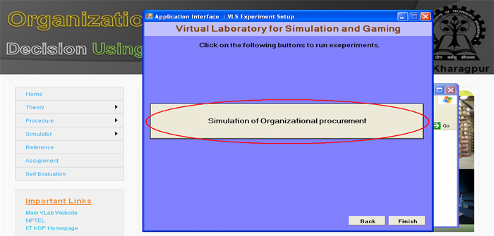 21. Now you can click the "Simulation of Organizational Procurement" button to run the experiment directly from here or you click on " Finish" button to complete installation. If you are not running the experiment from here then you use the "shortcut under Program menu or desktop" to run the experiment.