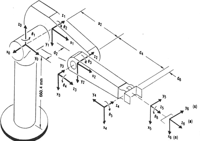 Forward kinematics (FK) mainly deals with constructing a Denavit-Hartenberg (D-H) transformation matrix with Puma's parameters obtained from a D-H parameter table shown below: